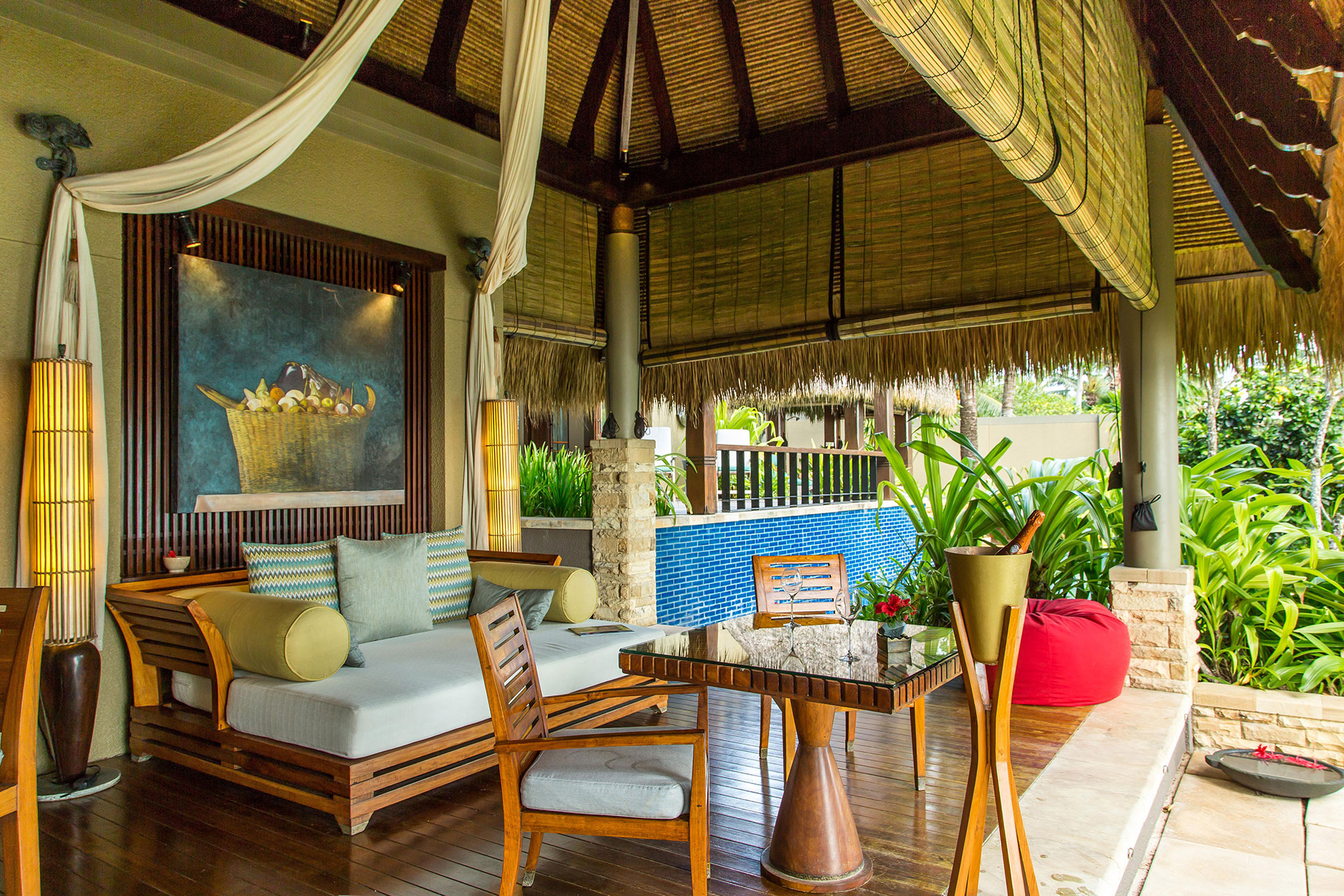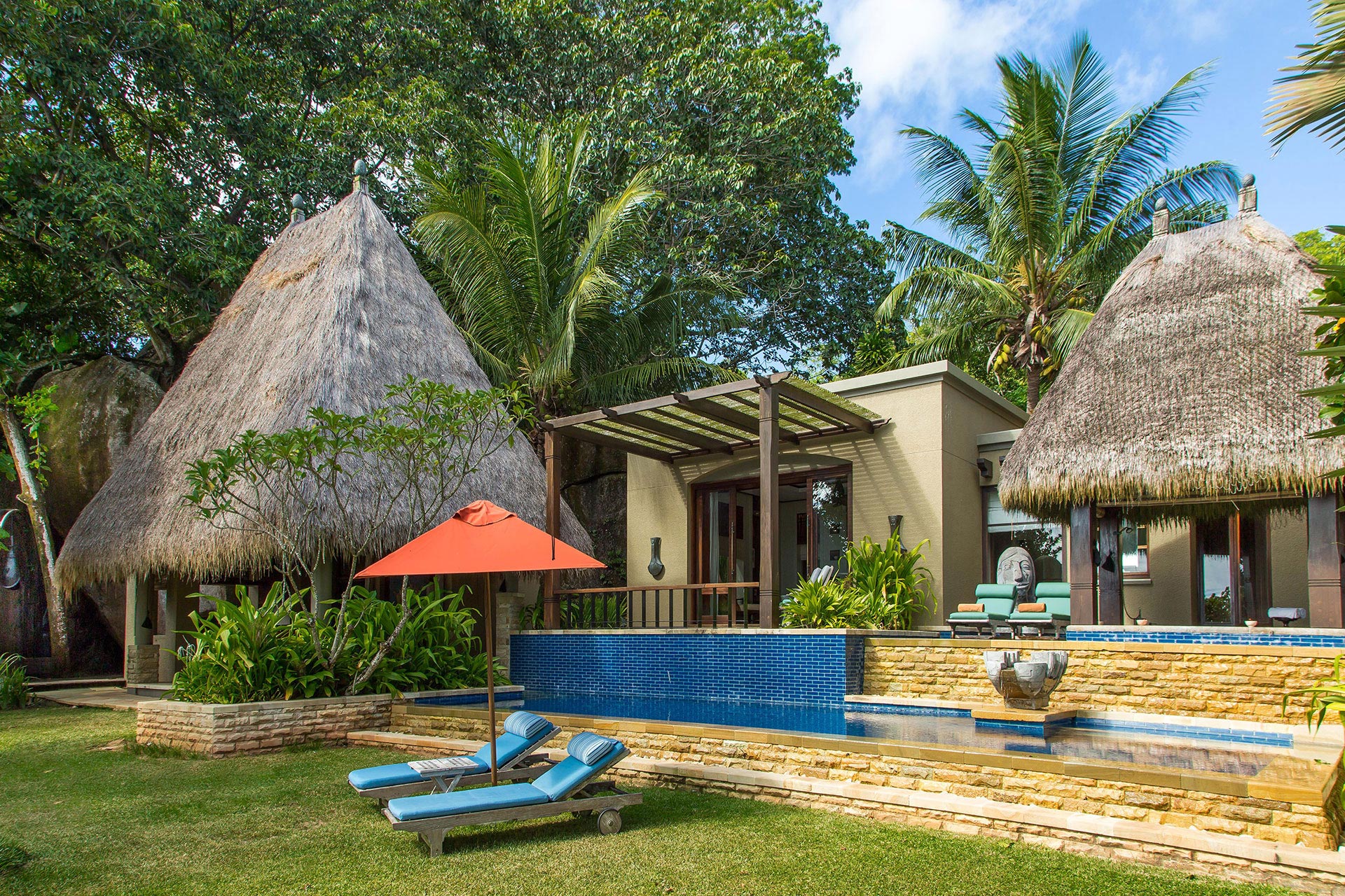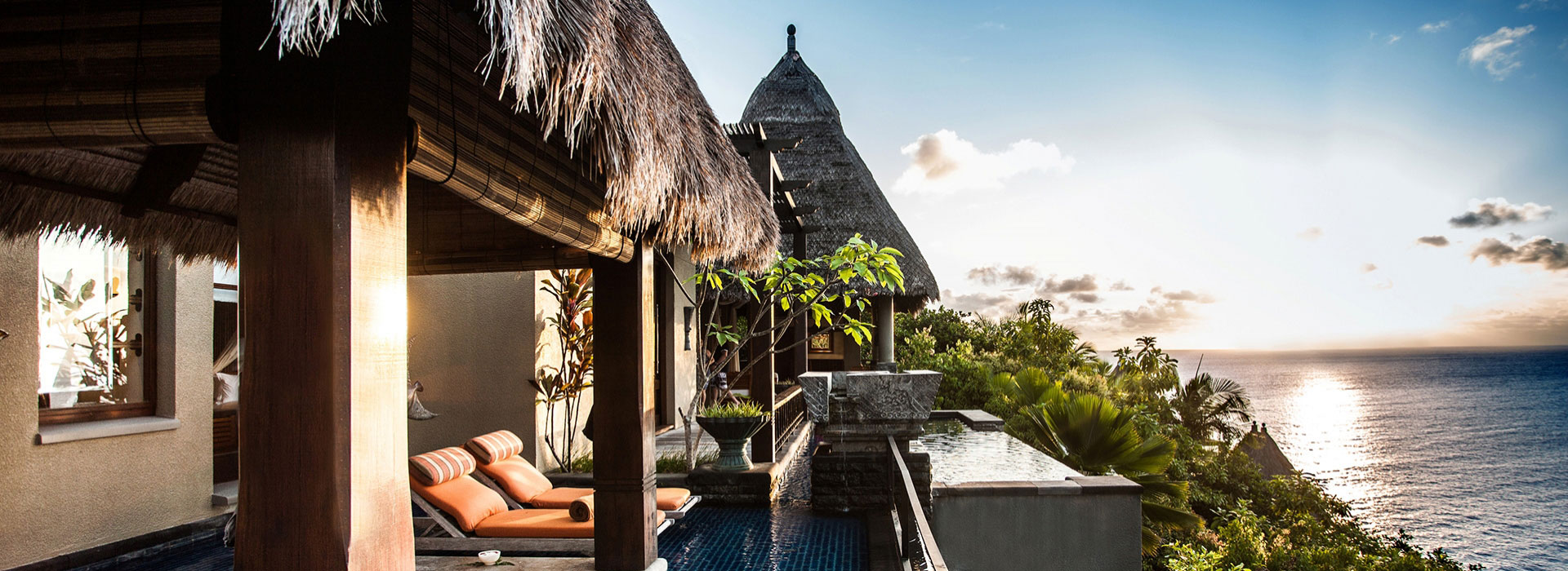 Die tropische Hanglage in üppiger Landschaft bietet 180-Grad-Blick auf den Indischen Ozean. Eine geräumige Pavillon Lounge lockt mit entspannendem Tagesbett und großem Swimmingpool. Im Freien: ein Whirlpool für romantische Champagnerabende. Hier läuft die Zeit langsamer.