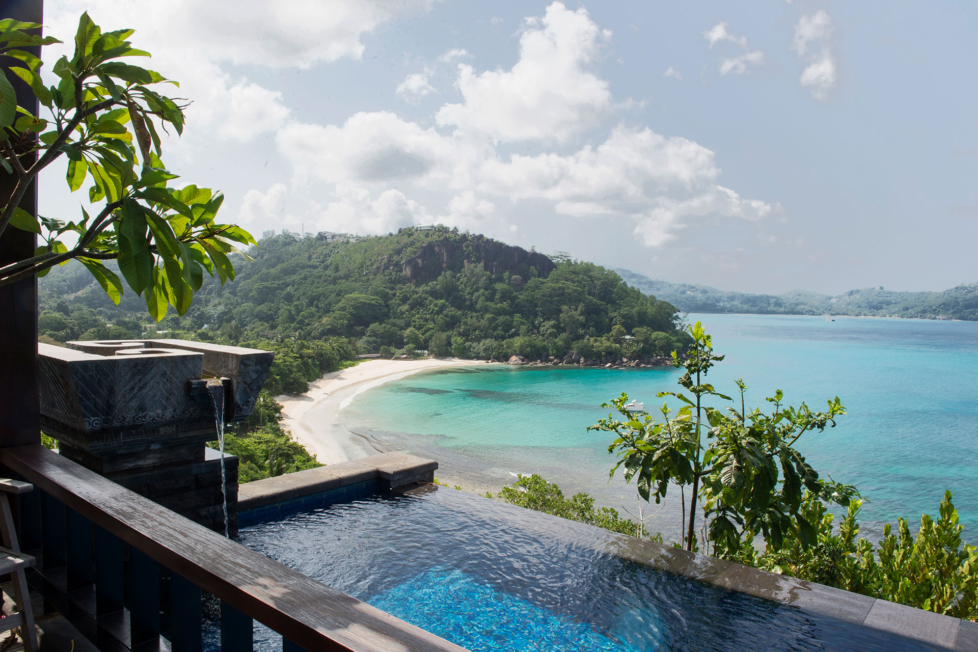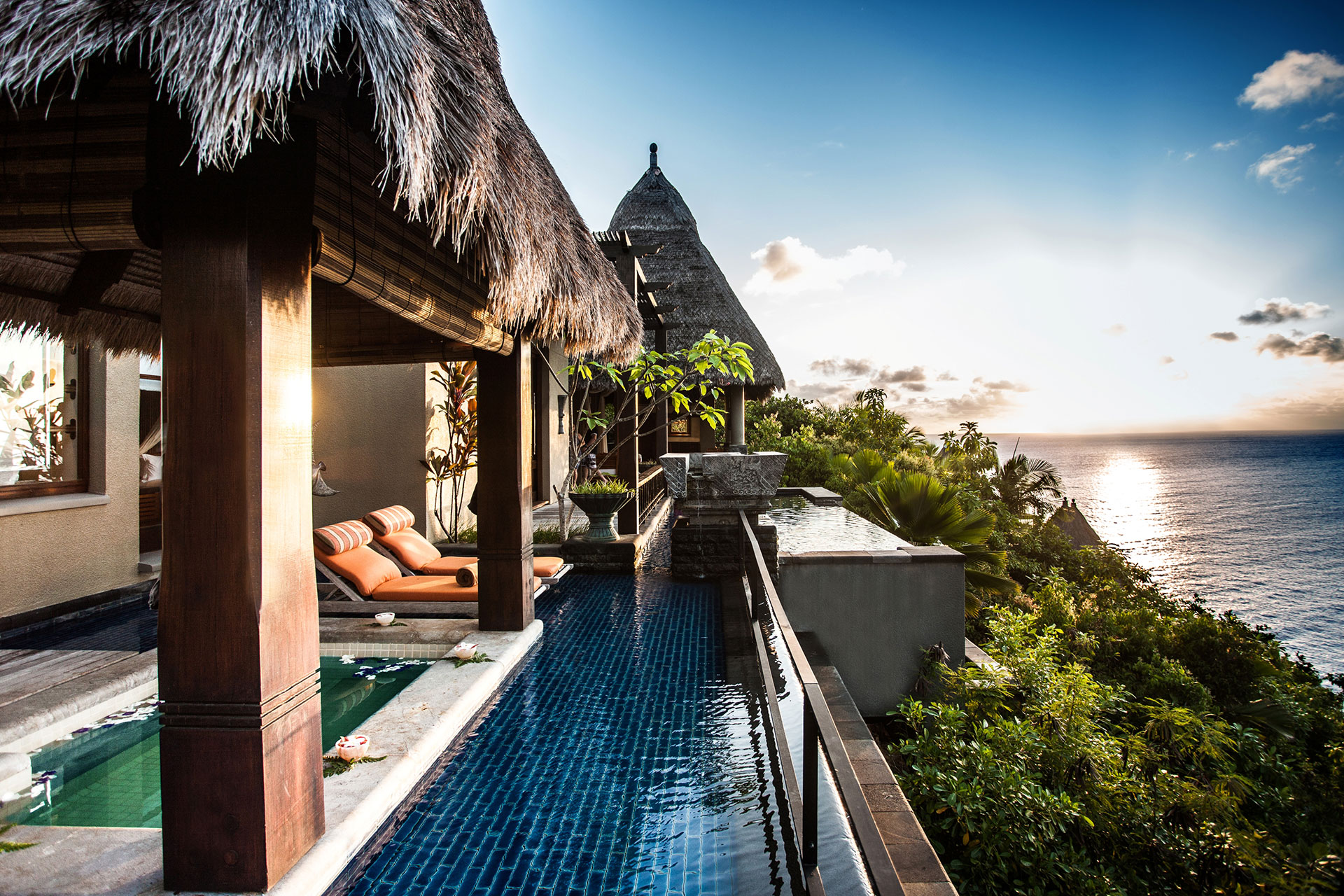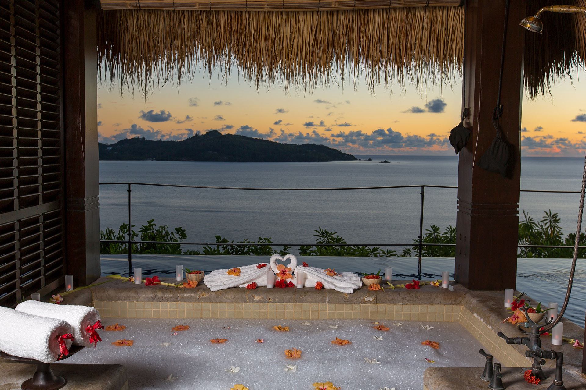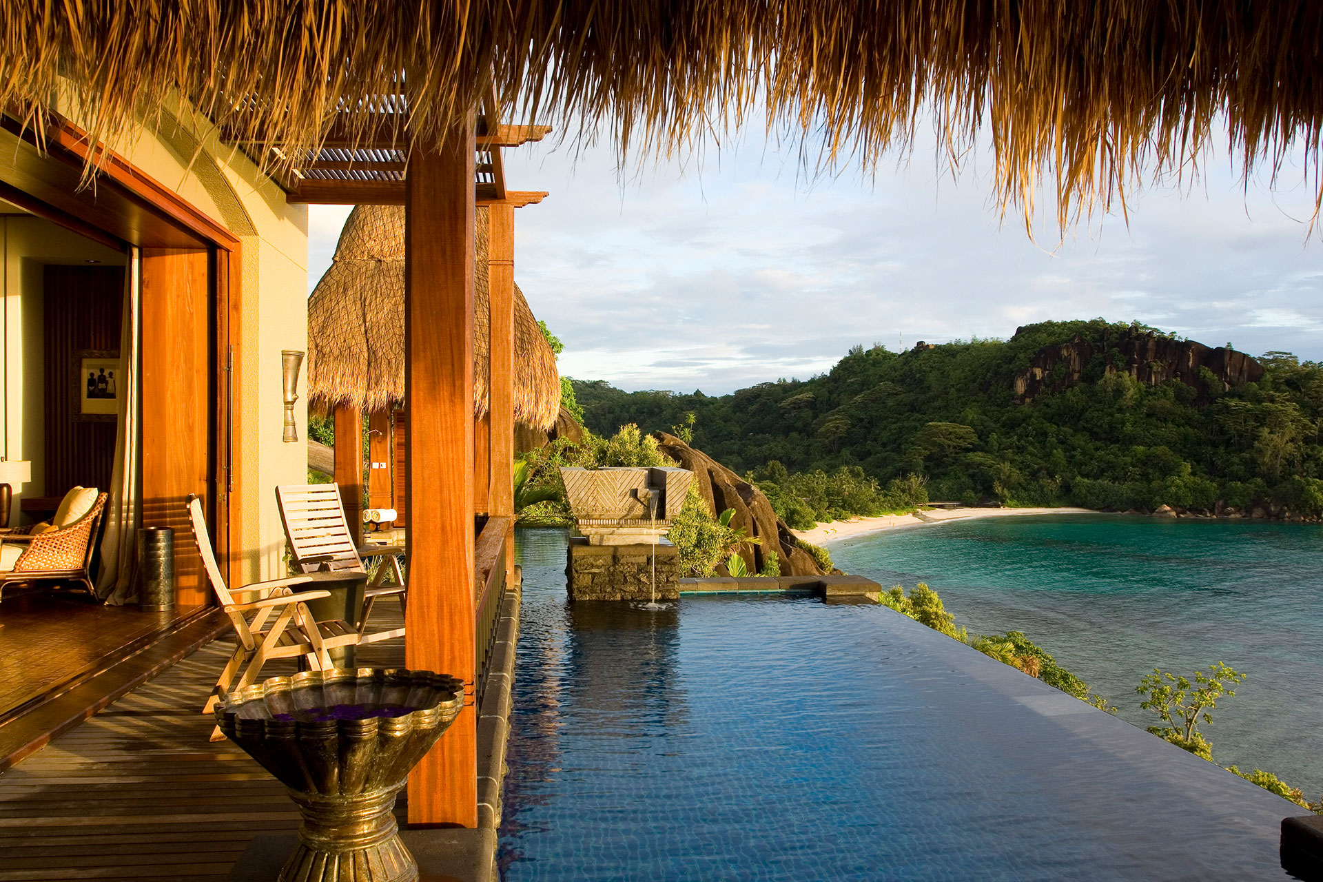 Die tropische Hanglage in üppiger Landschaft bietet 180-Grad-Blick auf den Indischen Ozean. Eine geräumige Pavillon Lounge lockt mit entspannendem Tagesbett und großem Swimmingpool. Im Freien: ein Whirlpool für romantische Champagnerabende. Hier läuft die Zeit langsamer.