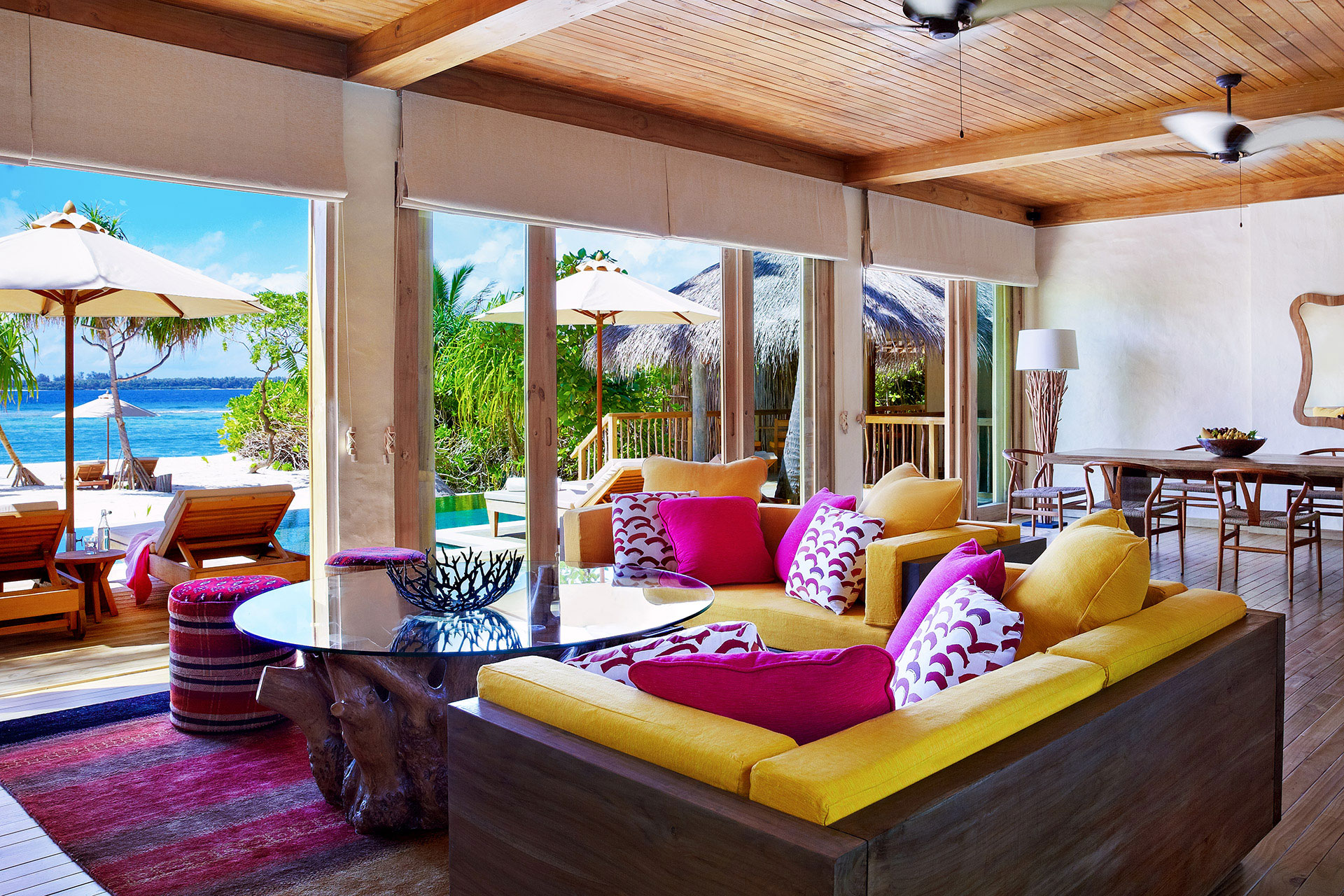 Diese Villa ist das perfekte Hideaway zwischen Palmen, schattigen sowie sonnigen Plätzchen und direktem Zugang zur türkisblauen Lagune. Im zweiten Stock des Etablissements befindet sich ein toller Essbereich mit fantastischem Meerblick!
